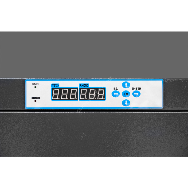 Low humidity storage cabinets use physical humidity absorbing, the core part is dry unit, the dry unit automatically adjusts the humidity absorbing and exhausting circulation processes, there are different RH ranges for your selection, such as 20-60%RH/10-20%RH/<10%RH/<5%RH/<3%RH, it depends on your specific demands.